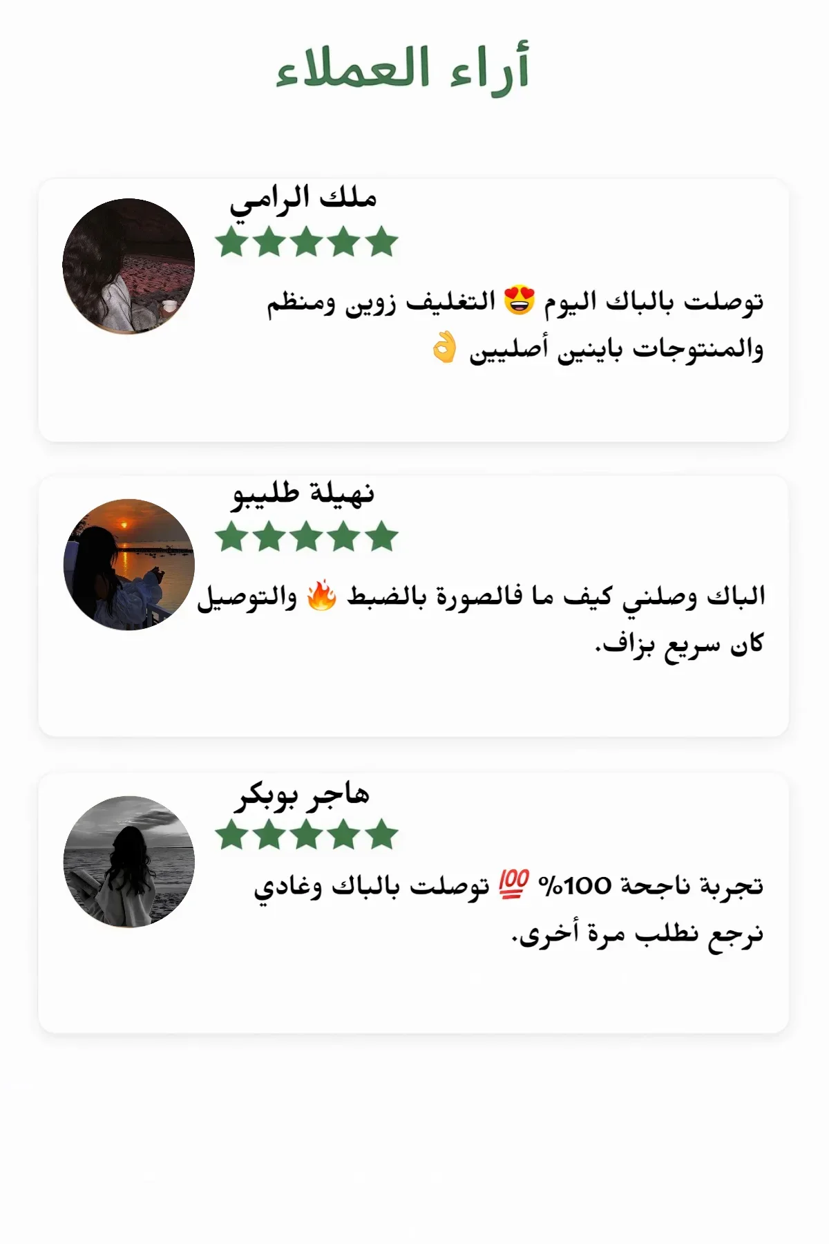 مدة التوصيل تتراوح بين 24 و72 ساعة حسب المدينة، والدفع يتم عند الاستلام لضمان راحتكم وثقتكم